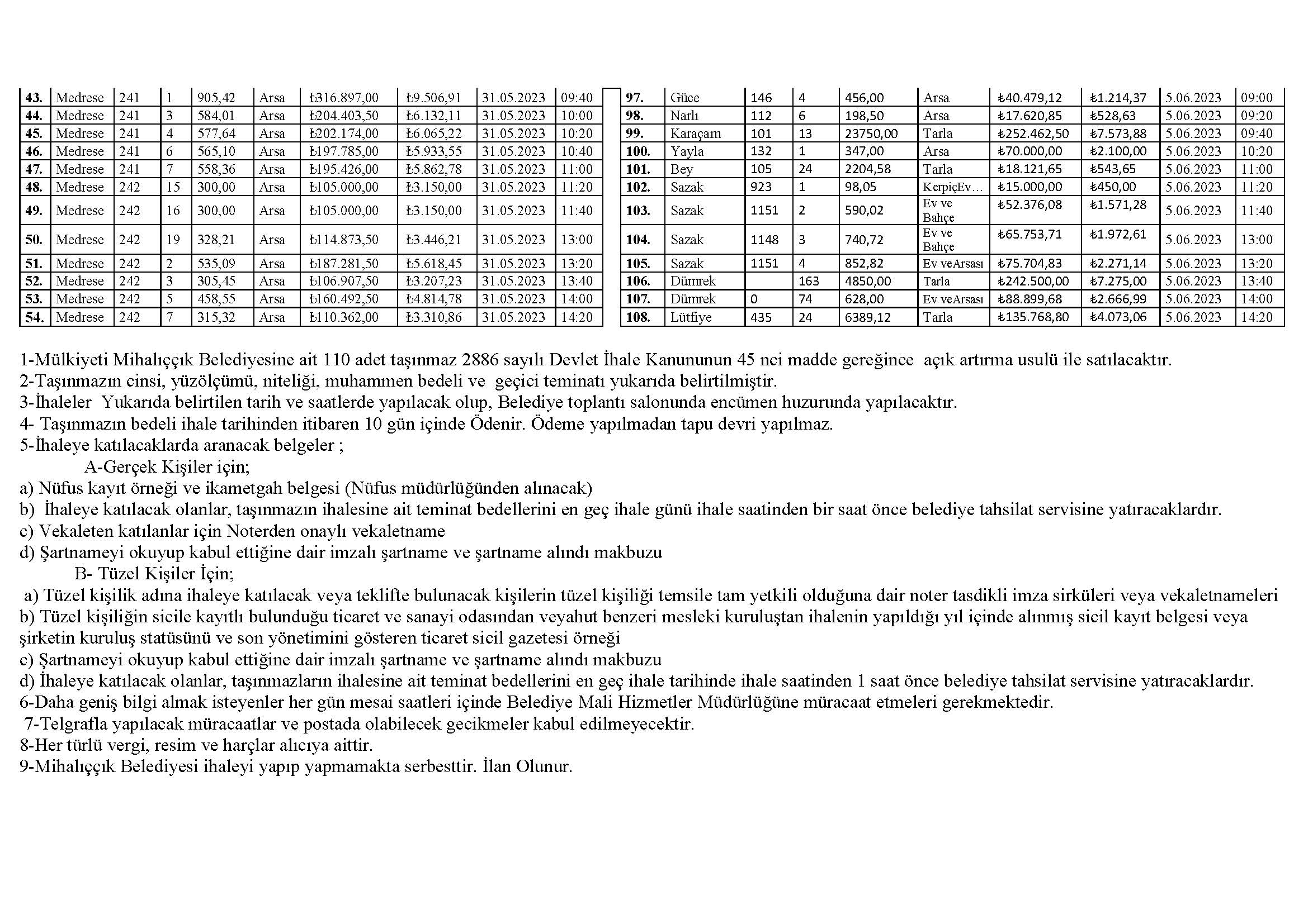 Mülkiyeti Mihalıççık Belediyesine ait 110 adet taşınmaz 2886 sayılı Devlet İhale Kanununun 45 nci madde gereğince açık artırma usulü ile satılacaktır.