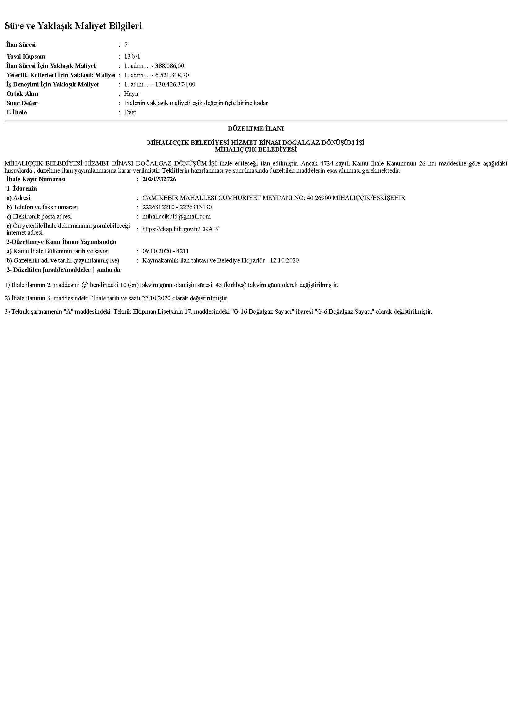 Eskişehir Mihalıççık Belediyesi Başkanlığınca Mihalıççık Belediyesi Hizmet Binası Doğalgaz Dönüşüm İşi ihale ile yaptırılacaktır. İhale için detaylara, aşağıda bulunan linkler aracılığı ile ulaşabilir, inceleyebilirsiniz.