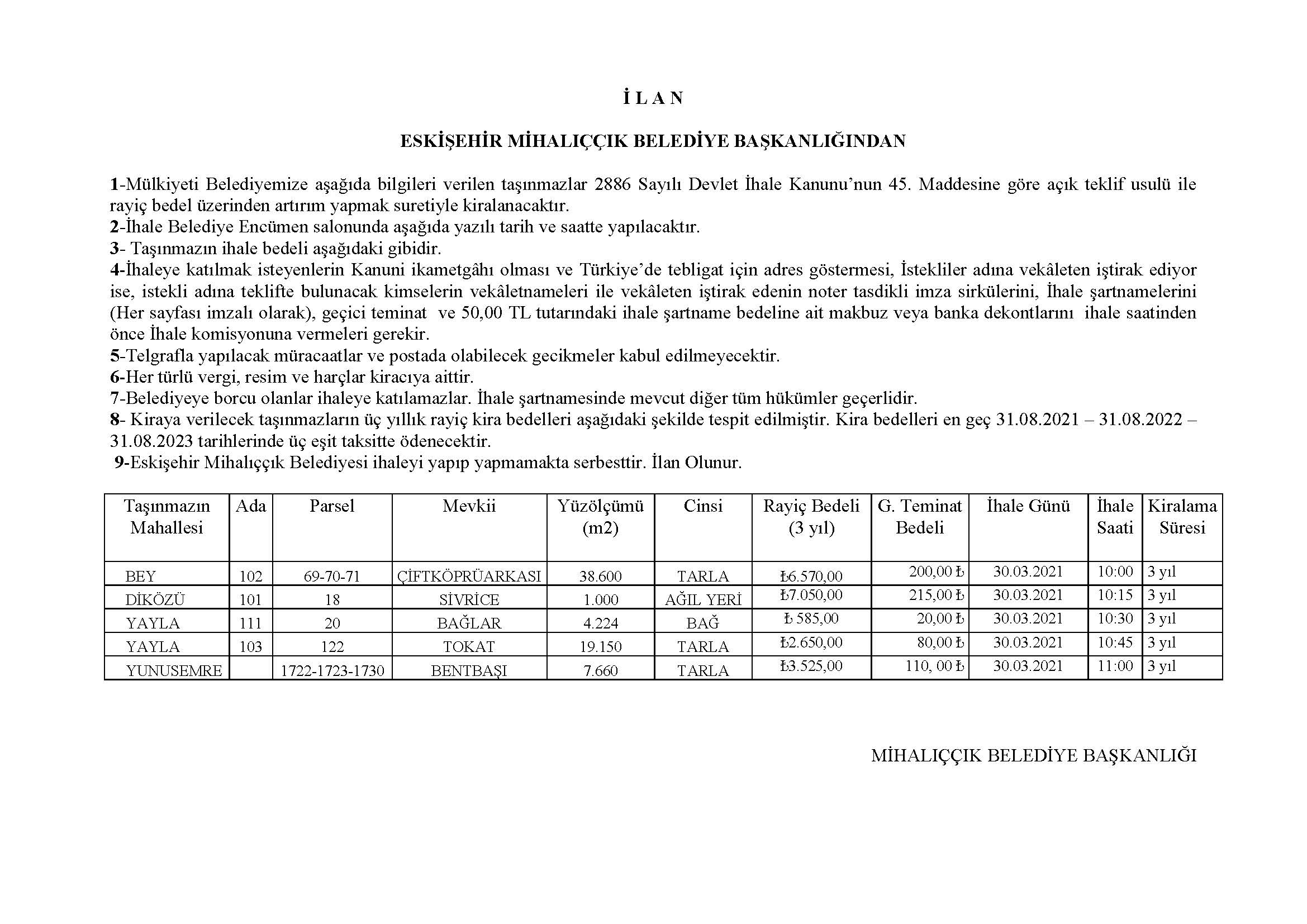 Mülkiyeti Belediyemize aşağıda bilgileri verilen taşınmazlar 2886 Sayılı Devlet İhale Kanunu’nun 45. Maddesine göre açık teklif usulü ile rayiç bedel üzerinden artırım yapmak suretiyle kiralanacaktır.
