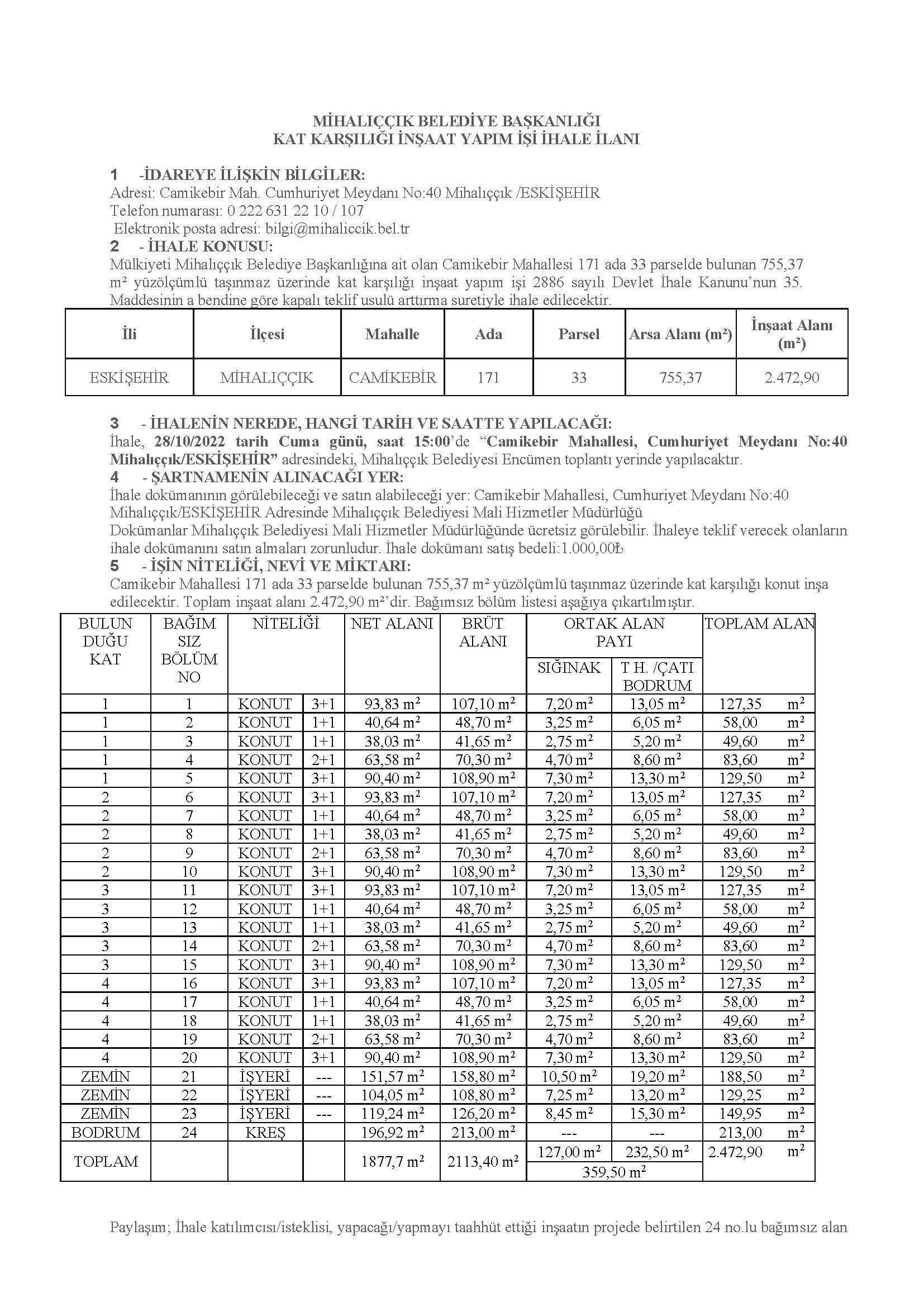 Mülkiyeti Mihalıççık Belediye Başkanlığına ait olan Camikebir Mahallesi 171 ada 33 parselde bulunan 755,37 m² yüzölçümlü taşınmaz üzerinde kat karşılığı inşaat yapım işi