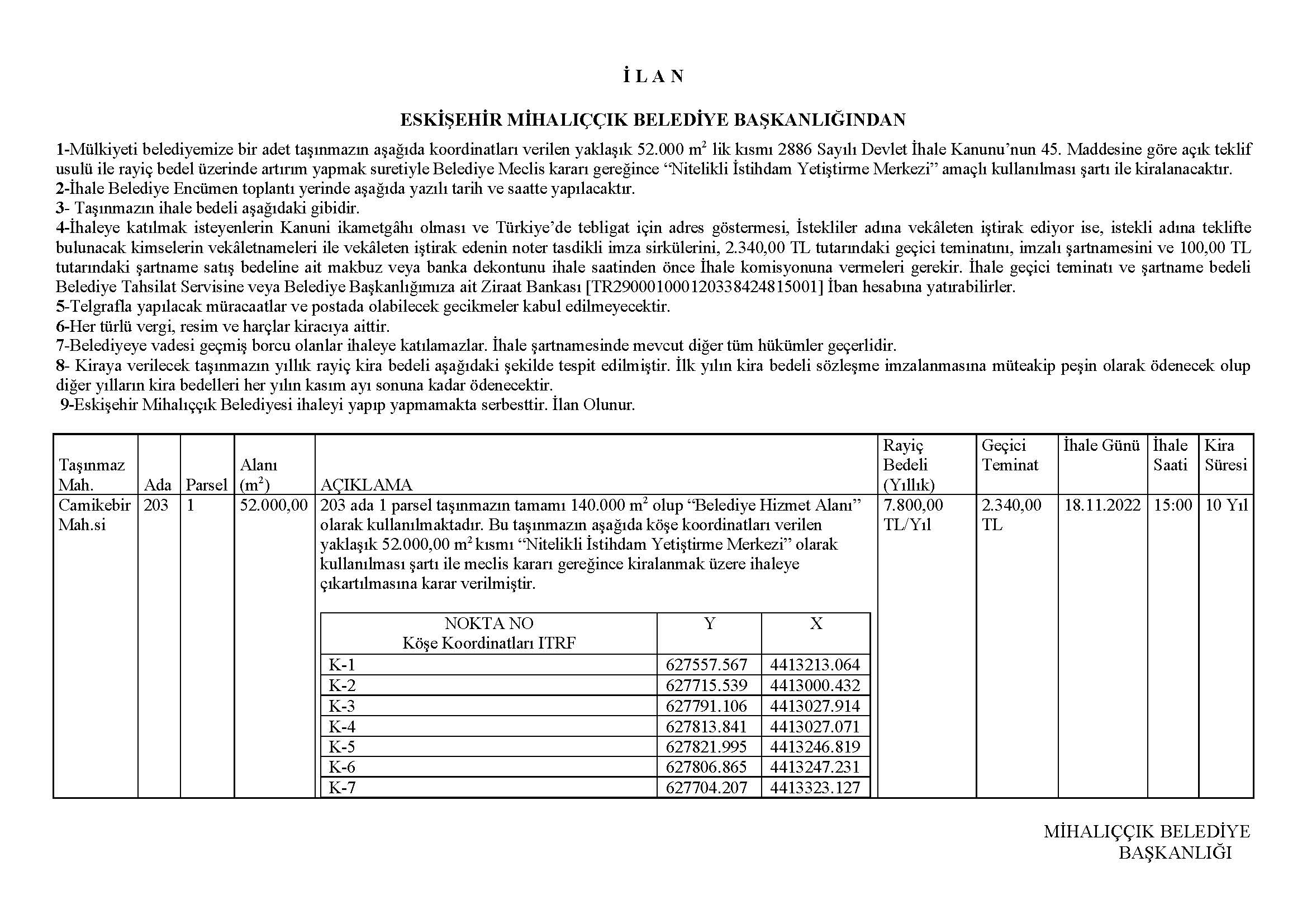 Mülkiyeti belediyemize bir adet taşınmazın aşağıda koordinatları verilen yaklaşık 52.000 m2 lik kısmı “Nitelikli İstihdam Yetiştirme Merkezi” amaçlı kullanılması şartı ile kiralanacaktır.