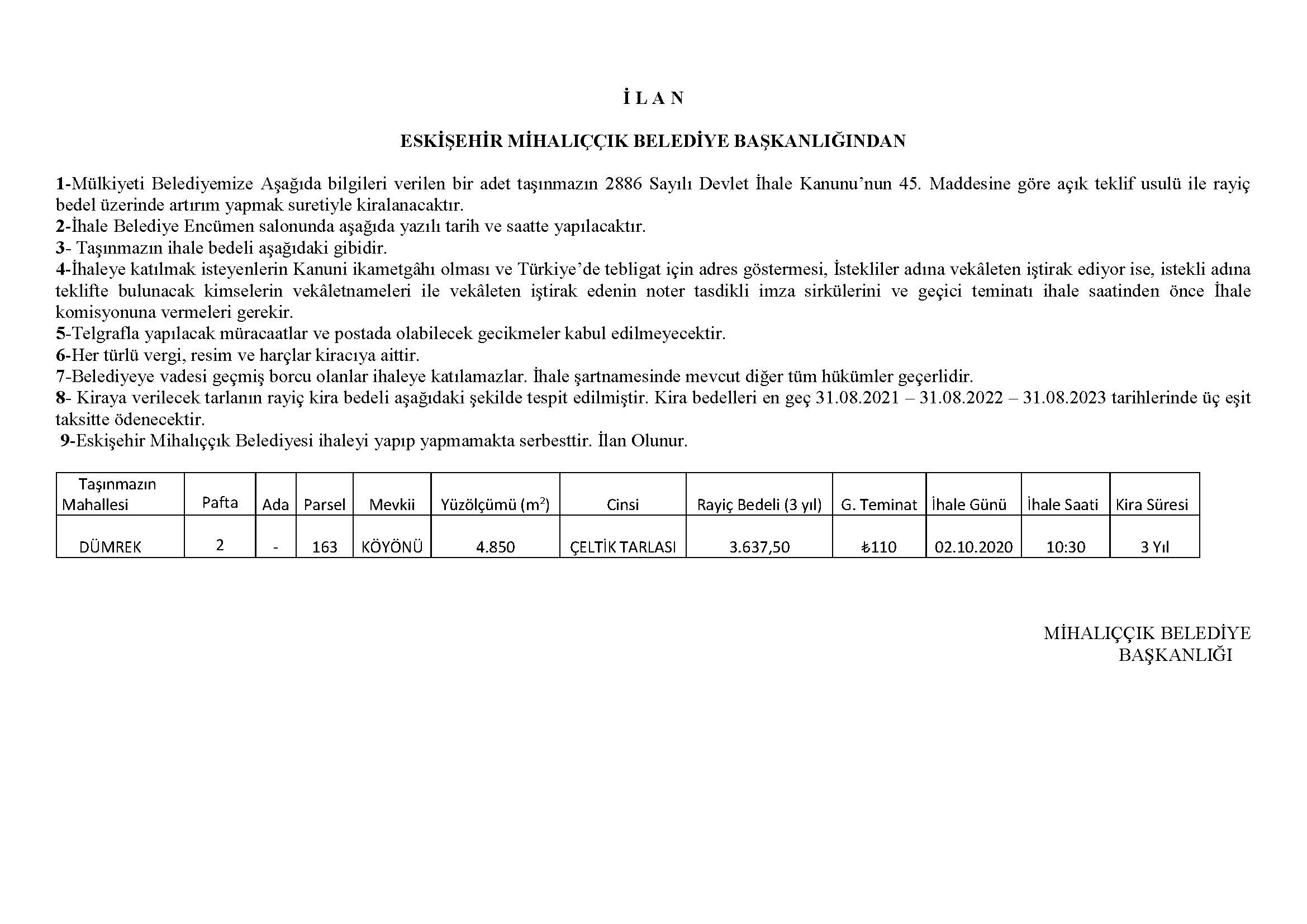 Mülkiyeti Belediyemize ait aşağıda bilgileri verilen bir adet taşınmazın 2886 Sayılı Devlet İhale Kanunu’nun 45. Maddesine göre açık teklif usulü ile rayiç bedel üzerinde artırım yapmak suretiyle kiralanacaktır. İhale için detaylara, aşağıda bulunan linkler aracılığı ile ulaşabilir, inceleyebilirsiniz.