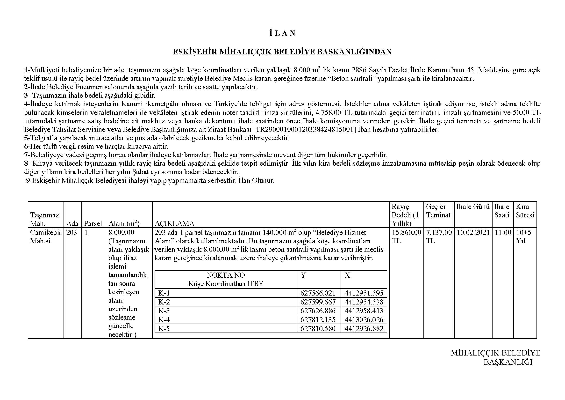 Mülkiyeti belediyemize bir adet taşınmazın aşağıda köşe koordinatları verilen yaklaşık 8.000 m2 lik kısmı 2886 Sayılı Devlet İhale Kanunu’nun 45. Maddesine göre açık teklif usulü ile rayiç bedel üzerinde artırım yapmak suretiyle Belediye Meclis kararı gereğince üzerine “Beton santrali” yapılması şartı ile kiralanacaktır. İhale için detaylara, aşağıda bulunan linkler aracılığı ile ulaşabilir, inceleyebilirsiniz.