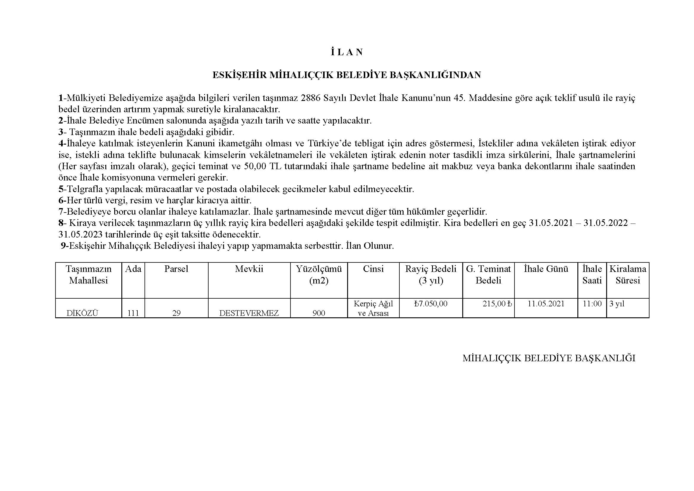 Mülkiyeti Belediyemize aşağıda bilgileri verilen taşınmazlar 2886 Sayılı Devlet İhale Kanunu’nun 45. Maddesine göre açık teklif usulü ile rayiç bedel üzerinden artırım yapmak suretiyle kiralanacaktır. (2)