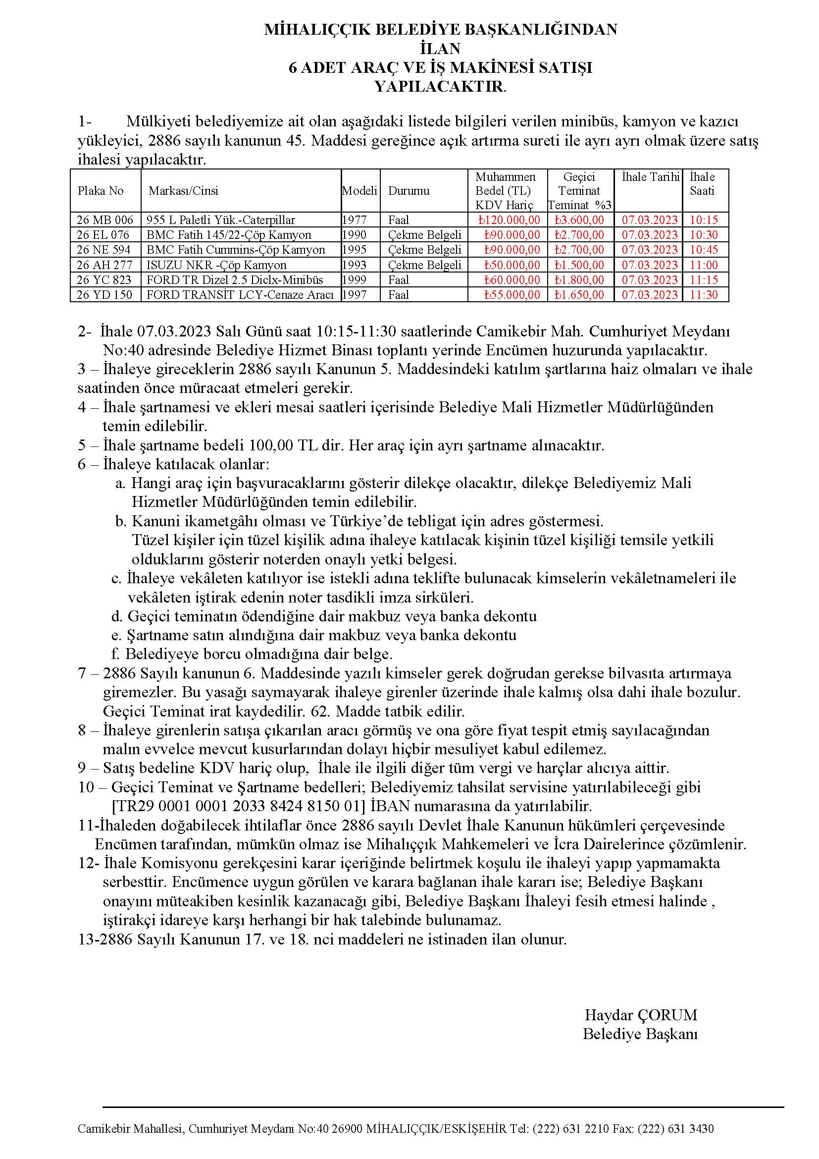 Belediyemize ait bilgileri verilen 6 adet taşıt,kamyon ve kazıcı yükleyici 2886 sayılı kanunun 45. Maddesi gereğince açık artırma sureti ile ayrı ayrı olmak üzere satış ihalesi yapılacaktır.