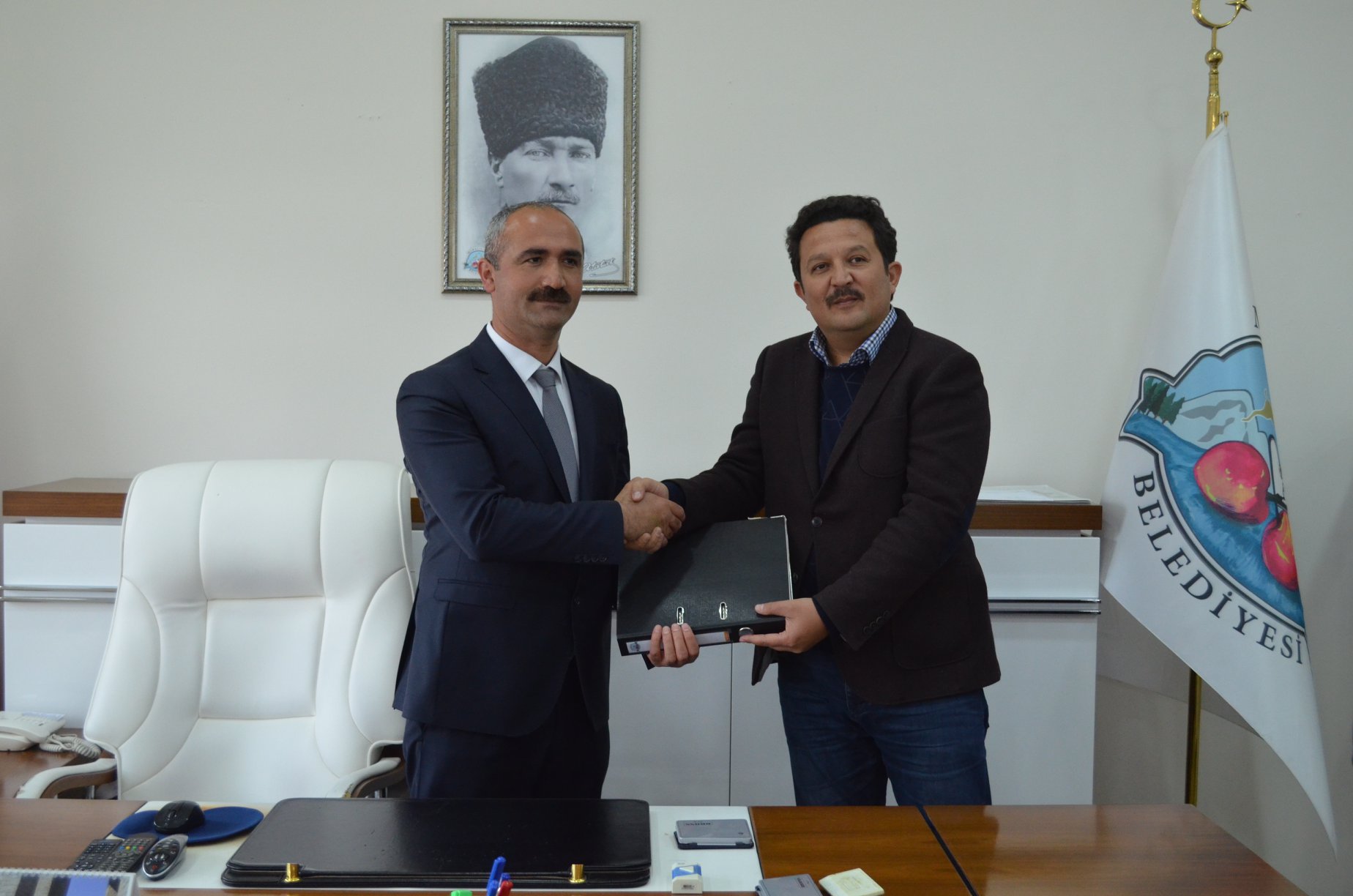 Mihalıççık Belediye Başkanımız Sayın Haydar ÇORUM 2014-2019 yılları arasında ilçemizde görev yapan Belediye Başkanı Sayın İsmail UYSAL'dan mazbatasını devir aldı.