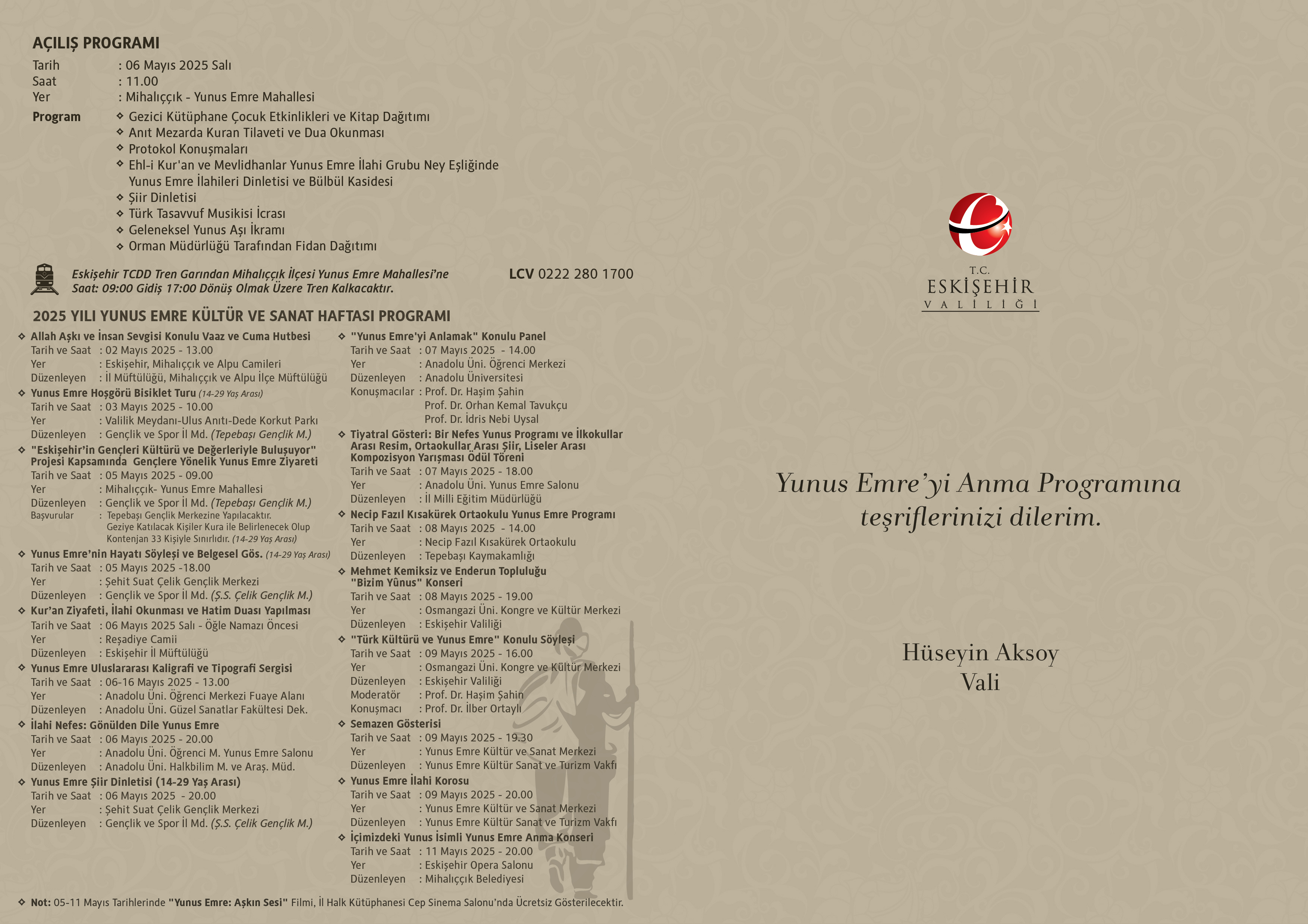6 Mayıs 2025 Salı günü gerçekleştirilecek olan Yunus Emre Anma Programı ve Hıdırellez Şenliklerine tüm halkımız davetlidir.