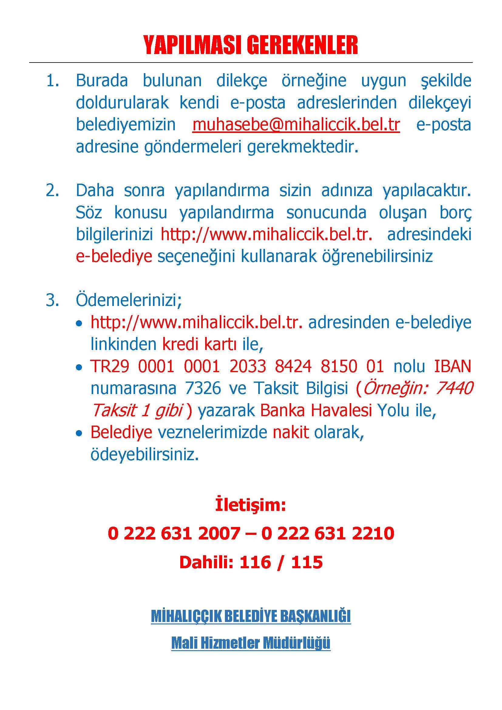 - Daha sonra yapılandırma sizin adınıza yapılacaktır. Söz konusu yapılandırma sonucunda oluşan borç bilgilerinizi http://www.mihaliccik.bel.tr. adresindeki e-belediye seçeneğini kullanarak öğrenebilirsiniz
