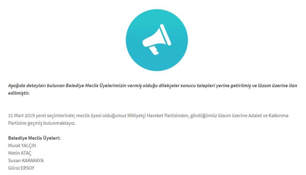 31 Mart 2019 yerel seçimlerinde; meclis üyesi olduğumuz Milliyetçi Hareket Partisinden, gördüğümüz lüzum üzerine Adalet ve Kalkınma Partisine geçmiş bulunmaktayız.