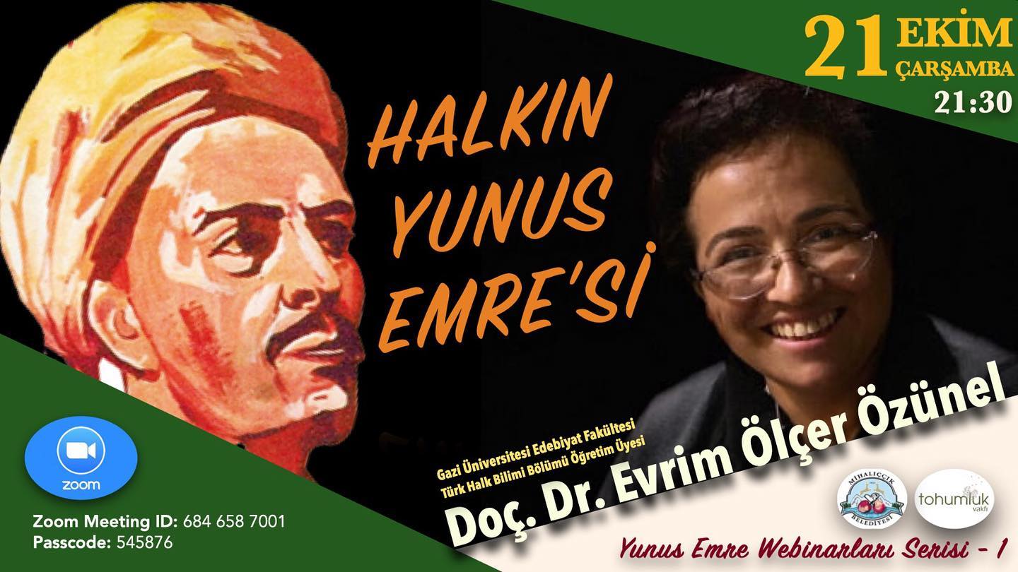 Mihalıççık Belediyesi’nin Tohumluk Vakfı ile birlikte düzenlediği Yunus Emre Webinarları dizisinin ilkinde Gazi Üniversitesi Edebiyat Fakültesi Türk Halk Bilimi Bölümü Öğretim Üyesi Doç. Dr. Evrim Ölçer Özünel, Halkın Yunus Emre’sini anlatıyor.
